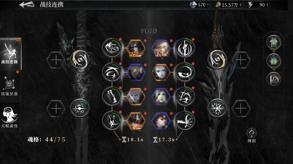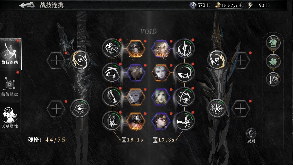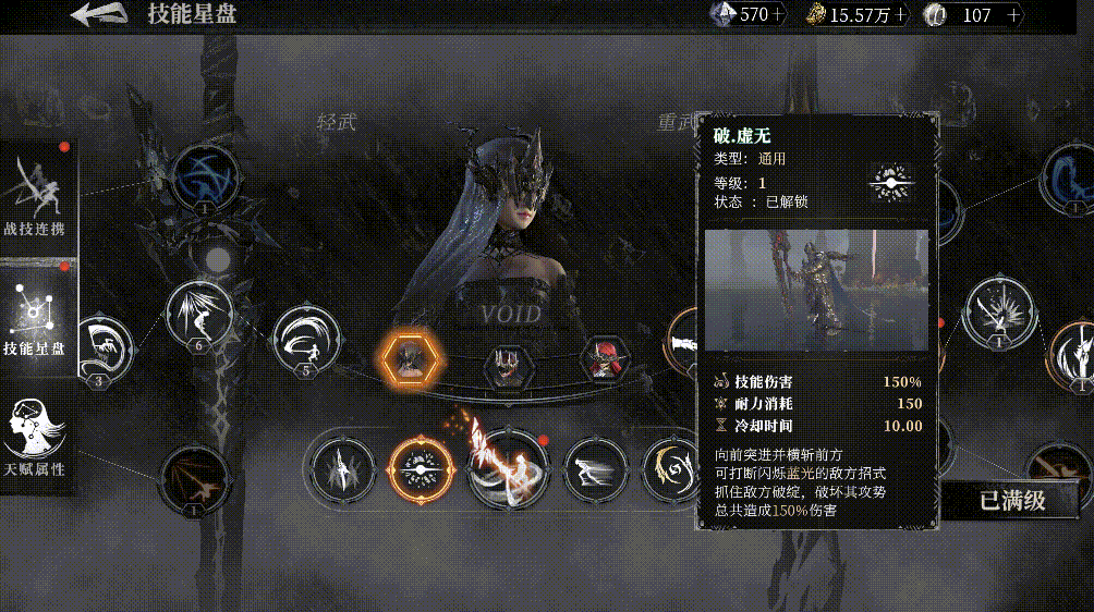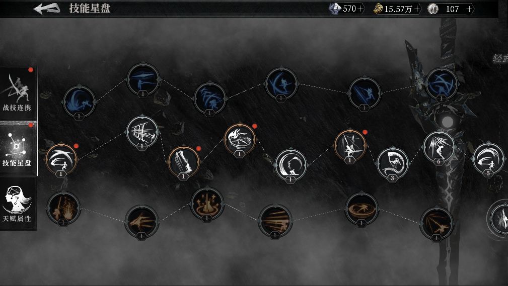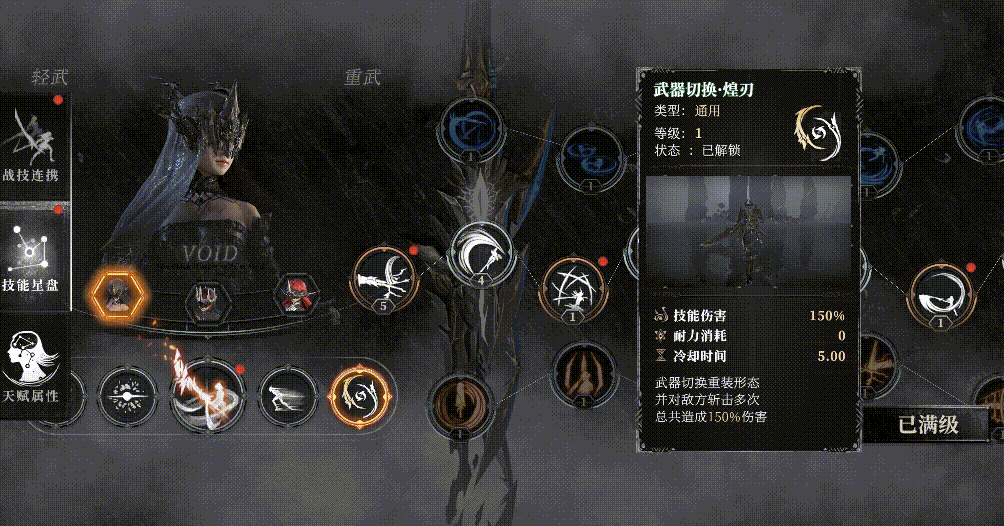 这是代行者·海拉的技能星盘,可以看到分有左右各一条线分别包含了海拉所有可以学习和使用的轻武器和重武器技能。