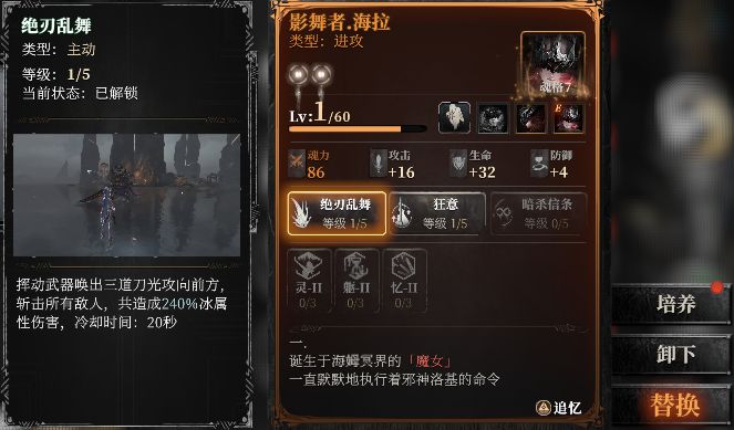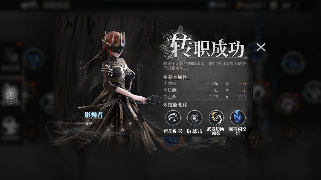 此外,继承者在角色等级到达18级后,可以解锁转职影舞者·海拉。转职完成后,角色属性,技能链,可装配技能等均会发生变化。可以看到影舞者海拉相较于代行者海拉有更高的攻击,更少的血量,可见代行者虽然没有影舞者的高攻击,但是血量的优势给予了新手更多的容错率。