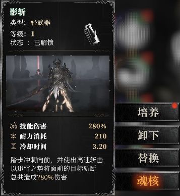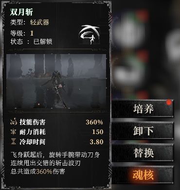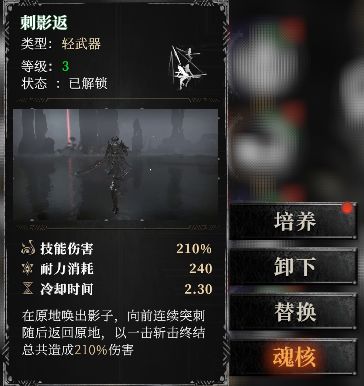 这使BOSS快速倒地,在打完轻武器技能链最后一个技能刺影返后,切换重武器利用余魂机制回复耐力,再使用重武器继续输出倒地BOSS。顺带一提,不止技能,切武器技能和破招技能也可以镶嵌魂核。