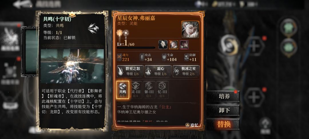 值得一提的是,有些特殊魂核会与特定技能产生共鸣效果,将这些魂核和特定技能绑定后技能变为共鸣状态,比如这里的十字切,在装配魂核星辰女神·弗丽嘉后,变成了技能十字切龙陨,改变了原有的技能形态,不仅技能伤害获得了大幅提升,这里的共鸣效果会使用冰之神剑,进行冰之突刺,造成冰属性伤害并且召唤黑翼幼龙进行攻击。