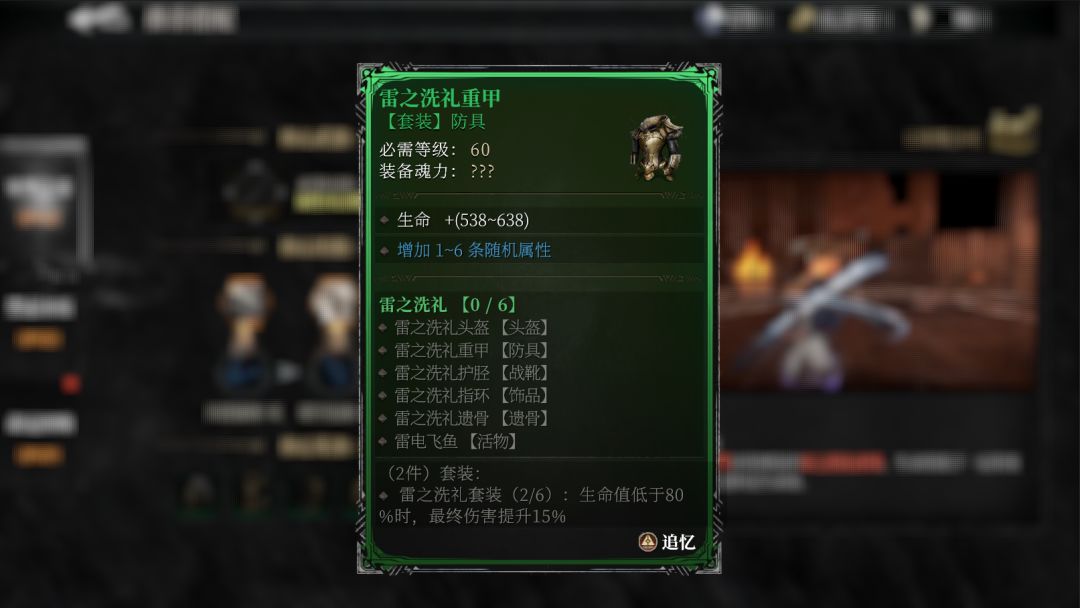 后期还可以获得套装,集齐【雷之洗礼套装】能解锁套装效果。套装效果是:生命值低于80%时,最终伤害提高15%。这对于一个近战职业来说非常容易触发,在没有足够熟练的情况下,继承者没有躲闪掉攻击受到一些伤害就会触发这个词条。配合受到伤害提升攻击力的武器,可以形成一个组合搭配。即便操作过硬保持了满血,也可以在适当的时机卖一些血量,主动控制触发这个词条的时机。不过这套【雷之洗礼】要到60级才能装备,集齐套装后能够激活套装的强力组合效果,使角色的战力再上一个台阶。