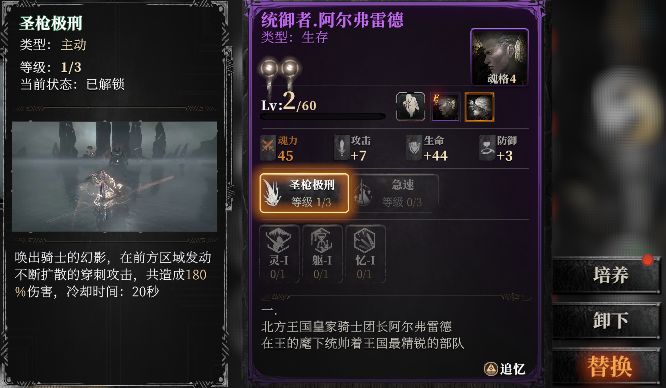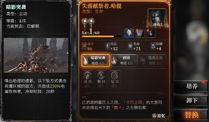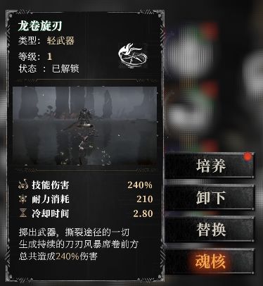 点击星盘内技能图标,可以看到技能描述。升级技能可以提升技能伤害,重置可免费返还所有技能点。在战技连携内完成装配之后可以看到已装配的技能链以及技能上附带的魂核。