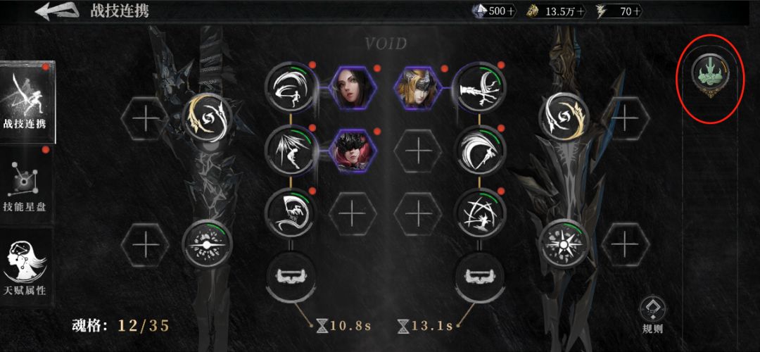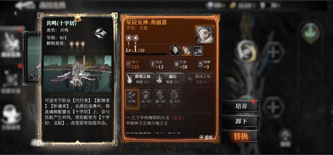 拥有【管理者欧德姆】、【霜龙·克希拉】、【星辰女神·弗丽嘉】等有特殊共鸣效果的魂核时,系统会优先按照其共鸣搭配技能。例如,【星辰女神】与海拉的十字切装备在同一位置时,可将【十字切】共鸣成【十字切·龙陨】。共鸣生效后,战技连携界面将有不同的特效展示。