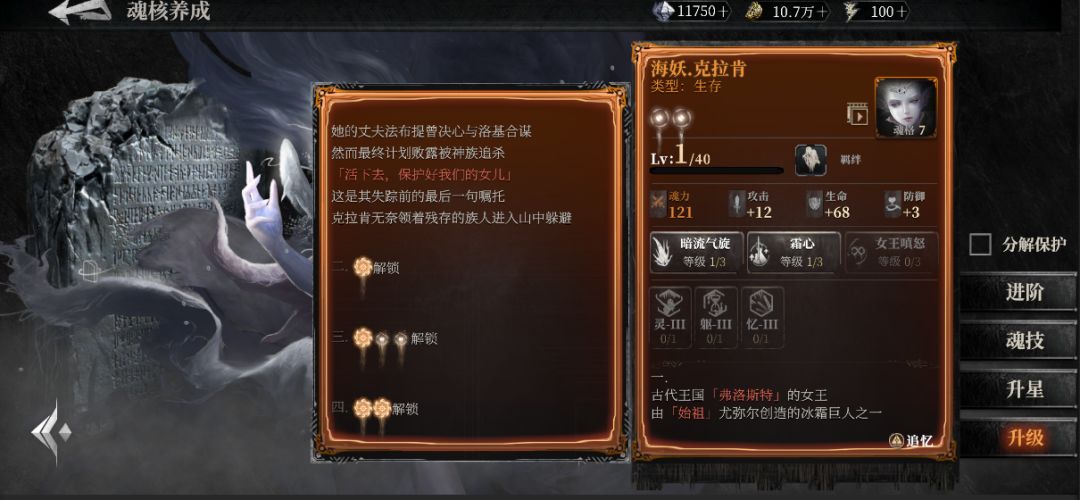 在魂核培养界面,继承者们可以对当前魂核进行培养。魂核拥有星级、等级、养成属性、魂核技能等级、魂核故事等基础信息,以上均可通过对魂核的培养进行提升或解锁。向右滑动,或点击左上角返回按钮,可返回魂核背包页面。