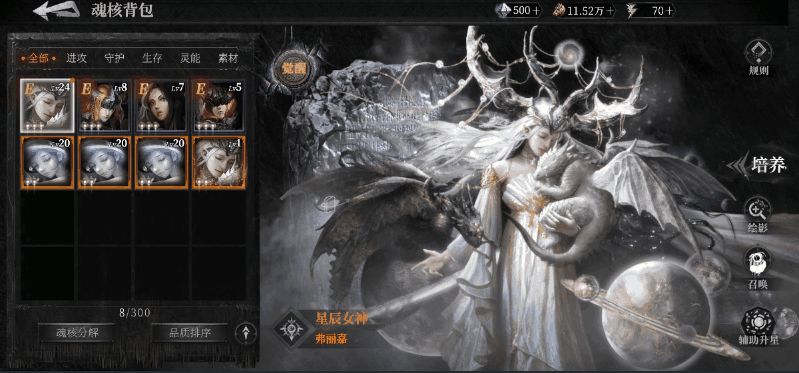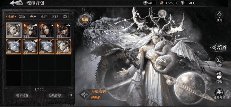 在魂核背包中,继承者们可以查看到自己的已有魂核,也可对其进行筛选、排序、分解、查看立绘等操作。同时,向左滑动可切换至魂核培养界面。