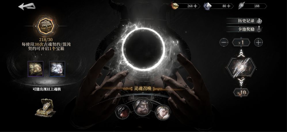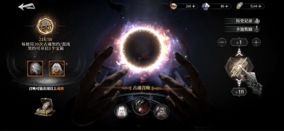 通过主界面【召唤】按钮进入,可以使用【古魂契约】进行召唤。召唤类型分为限时up召唤、古魂召唤、灵魂召唤。古魂和混沌召唤共计30次还可以获得额外宝箱,宝箱最多可获得6个古魂契约。