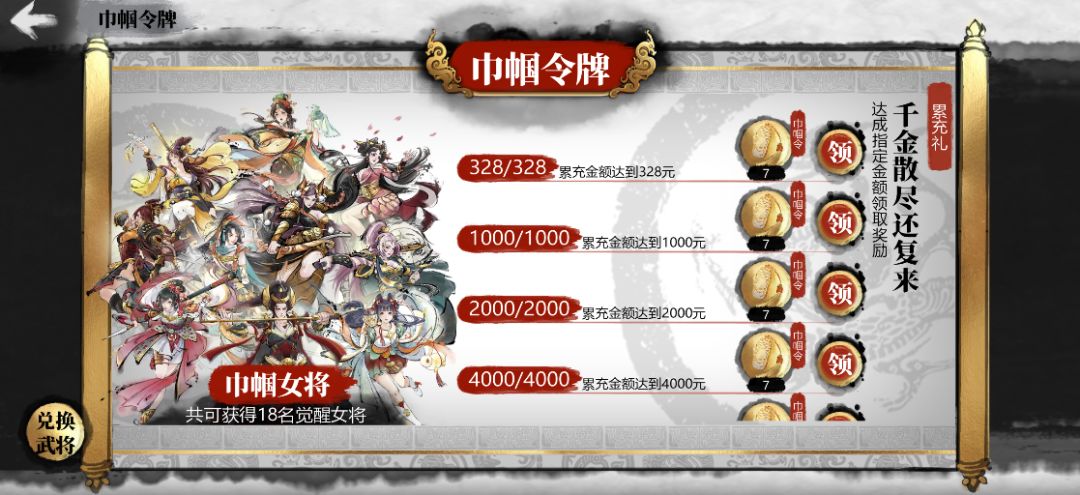 ●累充武将兑换货币可以直接在福利武将兑换商店中兑换想兑换的巾帼武将