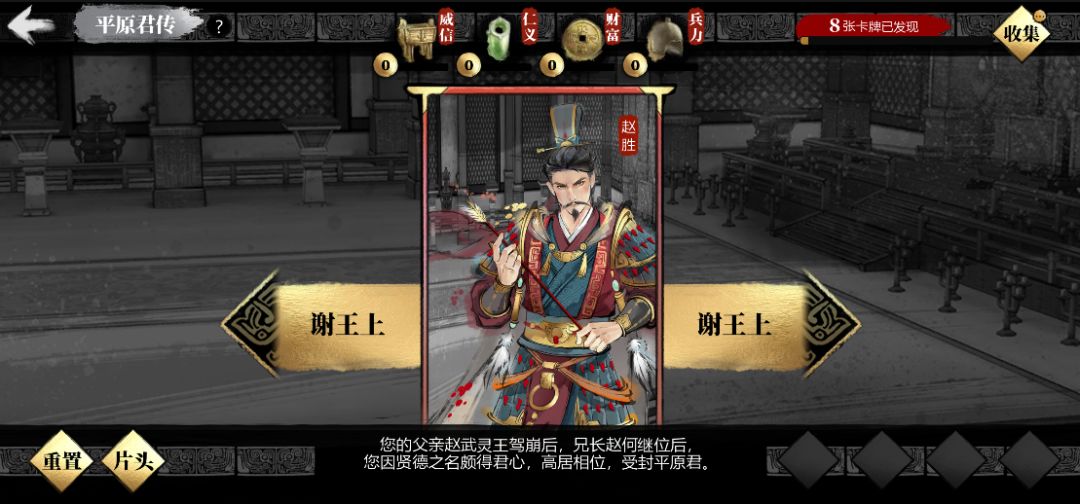 ●开放角色“赵胜”,剧本将还原赵胜人生中毛遂自荐、邯郸解围、从谏如流等诸多历史事件。玩家需要完成历史中的种种条件,与毛遂、辛垣衍、公孙龙等角色相遇,听从他们的谏言,体会赵胜在赵国历史中举足轻重的地位。