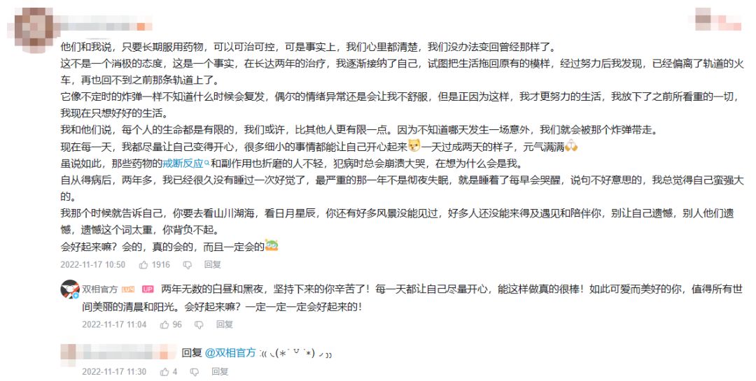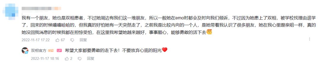 我们了解到还有这样一群小伙伴,他们是双相患者的家人、朋友、同学,他们陪伴在双相患者的左右,想尽自己全力去保护、帮助身边的双相患者,在我们的留言区评论道:“在这里我希望TA越来越好,事事顺心,能够勇敢地活下去”。