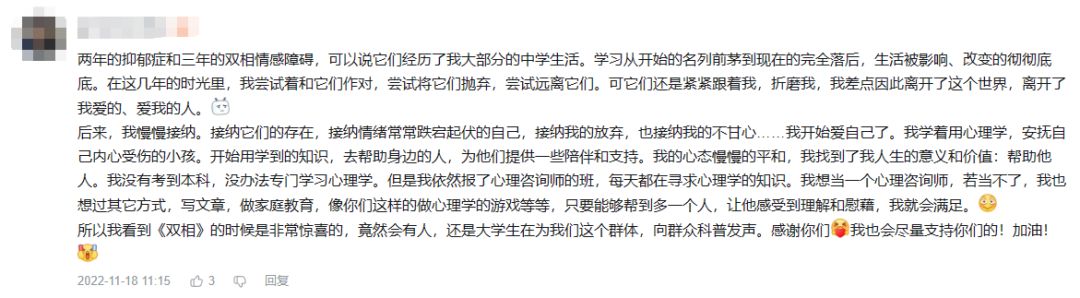 在留言中,我们了解到一些小伙伴的不断成长的经历。从开始的抗拒挣扎,到后来逐渐与自己的情绪和解,用理性和科学的方法来让自己变好。还有小伙伴在自我接纳的同时,还在分享自己的经验帮助身边的人,为他们提供一些陪伴和支持,成为他人生命里的一道光。