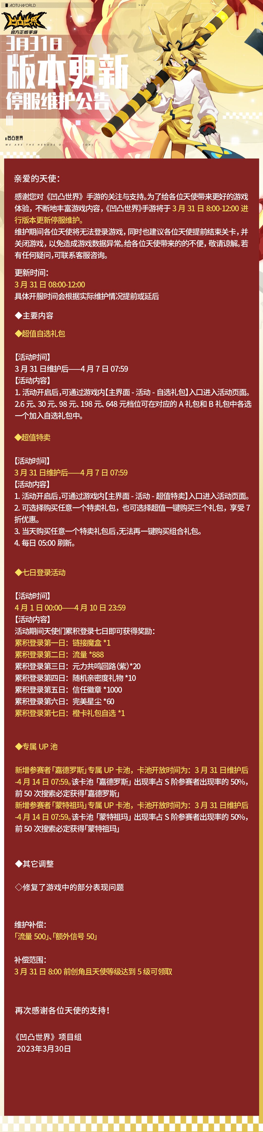 感谢您对《凹凸世界》手游的关注与支持。为了给各位天使带来更好的游戏体验,不断地丰富游戏内容,《凹凸世界》手游将于3月31日8:00-12:00进行版本更新停服维护。