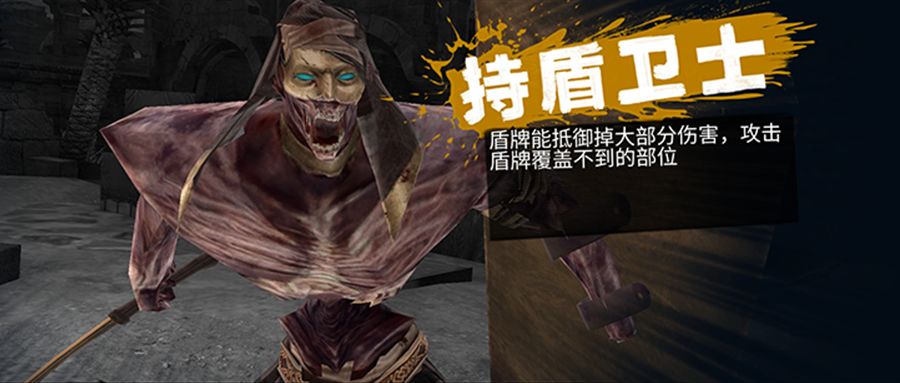 持盾卫士,左手持盾右手拿刀,攻防一体,按数值算是个比较强劲的对手。由于盾牌重量较大且为了有效保护自身,在持盾状态下其移动速度较慢。当护盾被击破后,其移动速度会大幅增加,快速跑向目标,挥刀攻击,攻击力较高。