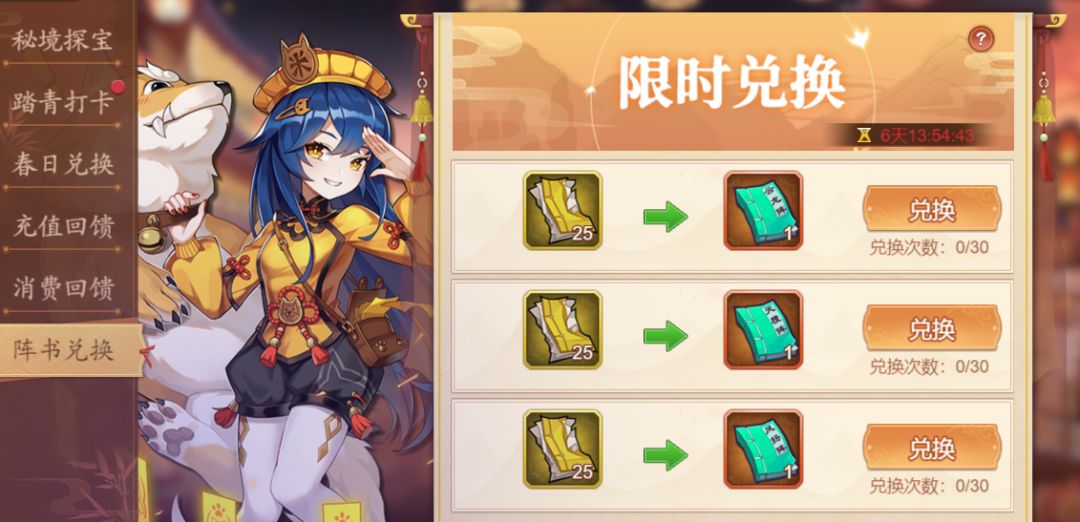 活动内容:活动期间可以消耗“阵书残页”兑换紫色和金色阵法书,阵书残页通过回收阵法书获得。