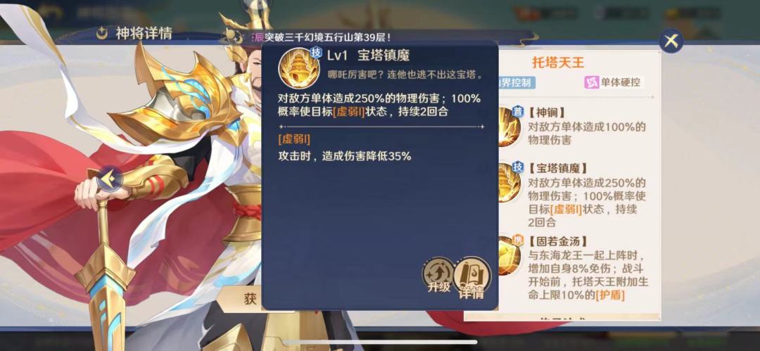在游戏中托塔天王是仙界控制和单体硬控会对敌方单体造成250%的物理伤害并且100%的概率使目标进入【虚脱I】状态,在和东海龙王同时上阵时,托塔天王自身获得免伤加成,并且在战斗开始前获得一个护盾效果这样使其就有了一定的坦度,可以再前排洗洗手上海也有很多宝子们都将他作为肉盾来使用。随着东海龙王的出场率逐渐升高,使得托塔天王的地位也水涨船高,突破+5的时候首次释放技能后必定使敌方后排的单体单位陷入到眩晕状态。达到+11时当托塔天王携带护盾时额外获得免伤效果,则将身上的虚弱状态传递给敌方全体,这个还是非常不错的。
