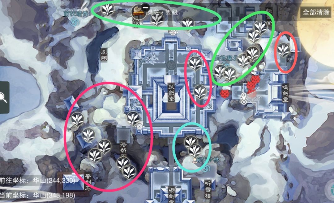 最佳采集点:华山;优点华山最多。缺点有的采集点可以自动寻路过去,如图绿色标志;有的采集点需要手动飞过去,如图红色标志;蓝色标志里的两个点,相隔五六步,需要手动跳下山崖采集。