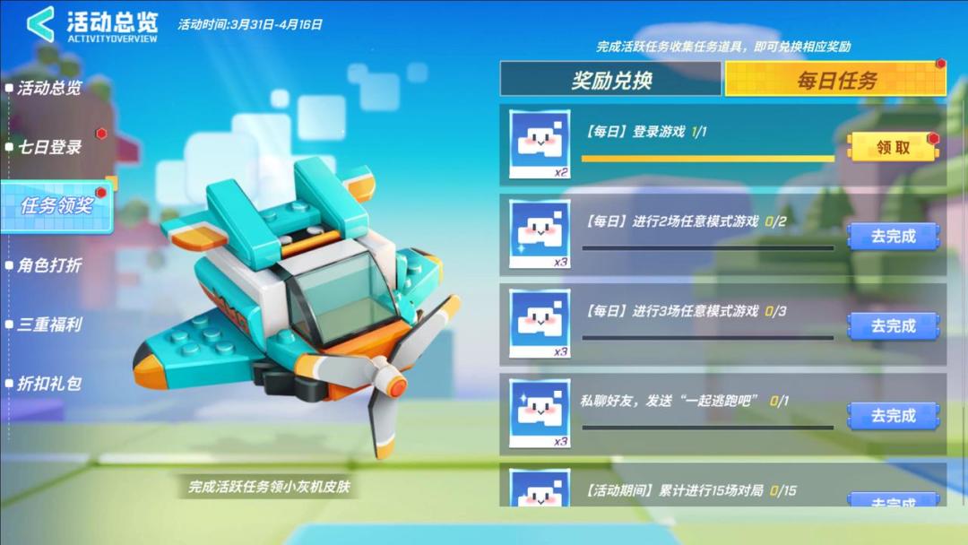 积累一定数量的【像素云朵】可以兑换丰富奖励哟~完成活跃任务就有全新皮肤【小灰机·拼装领空】等你拿~