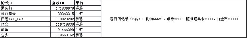 春日回忆录(10名):礼物666*1、点券*588、随机道具卡*388、白金币*3888