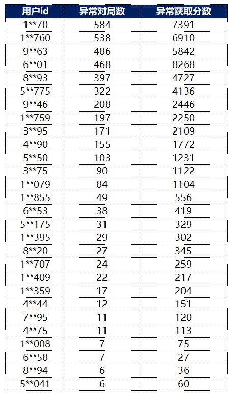 本次处理的全部异常对局的练习生名单公示如下:
