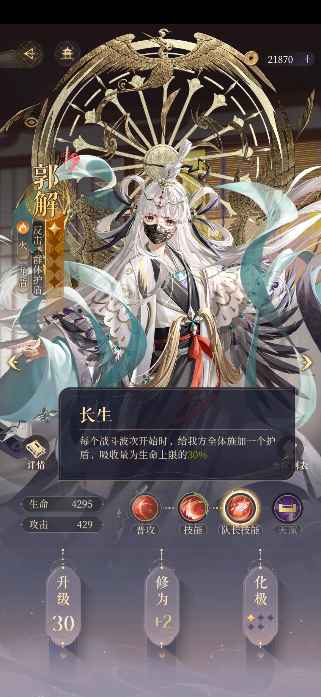 队长主要是给队员套盾接伤害,我前几遍试过把郭解放后面,奶妈打头阵,但是三回合的boss大招吃不下。如果有其他可以套盾的可以试试放队长,看看加成是什么