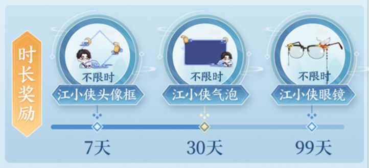 日积月聚,相伴送好礼。少侠只要持续关注江小侠,陪伴每一天,累积天数可 获得多重好礼。企业微信号关注时长(从不删档完成角色绑定后开始统计)达标可领取丰厚奖励:腰饰:侠义堂令牌(30天)、头饰:花游雀(30天)、时装:玉英竹烟(30天)、坐骑:赤翎玄金(30天)等。第7、30、99天更有3件不限时装饰和外观相迎,第365天可解锁最终礼包,神秘不限时外观等你来!