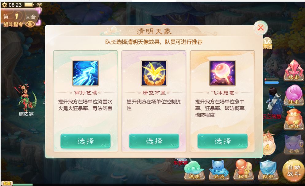 雨打芭蕉:提升我方在场单位风雷水火鬼火狂暴率、毒法伤害;晴空万里:提升我方在场单位控制抗性;飞冰怒雹:提升我方在场单位命中率、狂暴率、破防概率、破防程度。