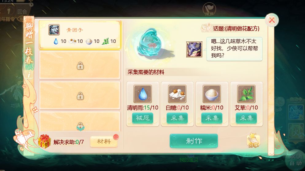 活动二:聊赠一枝春每日将解锁一位亡魂的请求,与亡魂们对话,推测配方、采集材料制作“水中花”,赠予对应的亡魂即可解其心结,获得经验和物品等赠礼,并解除一方雨灾;赠满7位亡魂,即有机会获得特殊召唤兽“雨师”!
