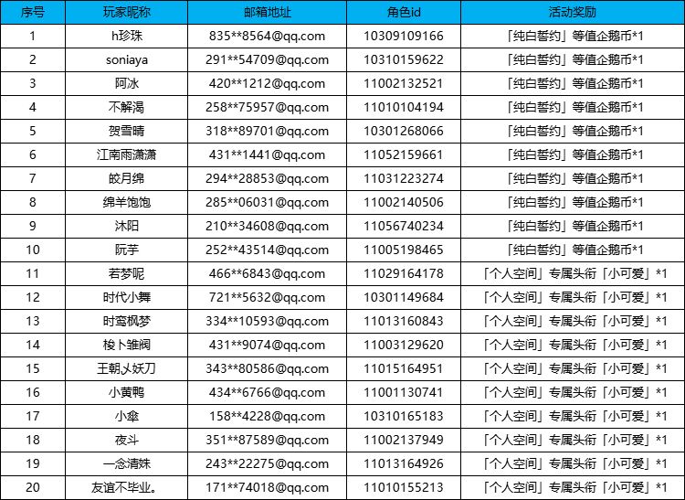 PS:奖励在45个工作日内发放,企鹅币奖励鸦鸦会通过邮件的方式进行发放,还请大家多多关注邮箱信息,及时激活邮箱哦~