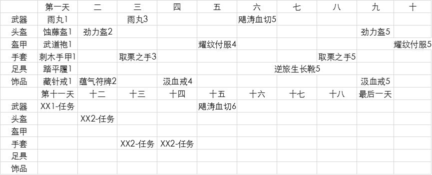 第三天:雨林弹幕挺多,可以吃吃小伤害,所以选择了能再生护甲的手套,适用于更多人。之后两个手套可以根据生存压力选择用。
