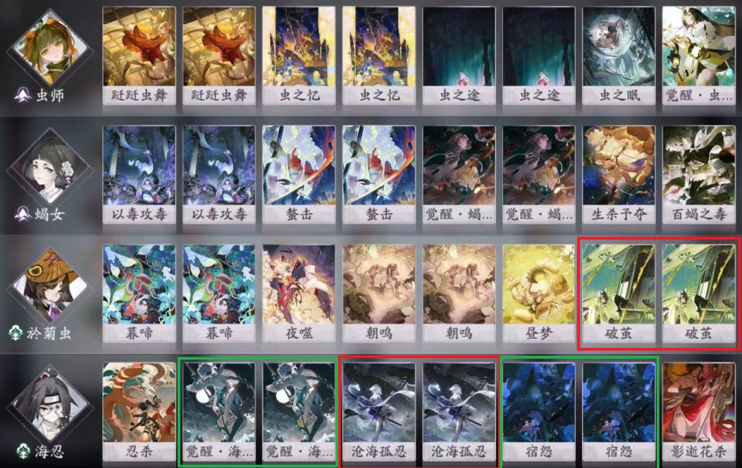 图是抄B站三三三的,因为我没卡,带卡各位自便,觉醒虫师有强度但毕竟SSR,於菊虫R卡若虫我觉得挺强的,他没带。