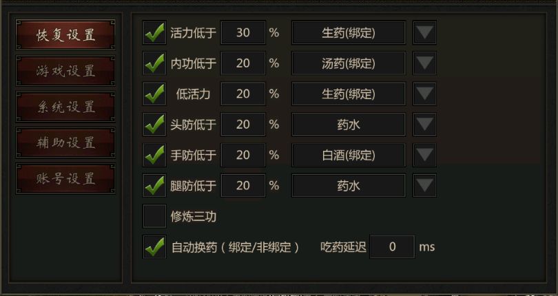 3、三防的作用 头防/手防/脚防 同时对应三防血量,头防血量过低会使得玩家无法切换武功和切换武器/手防血条过低时会影响玩家的攻击力/脚防过低时影响玩家的攻击速度,三防血条低于50%开始有影响,这里建议我们在设置里面把自动吃药打开,我们低于50三防之后使用药水。