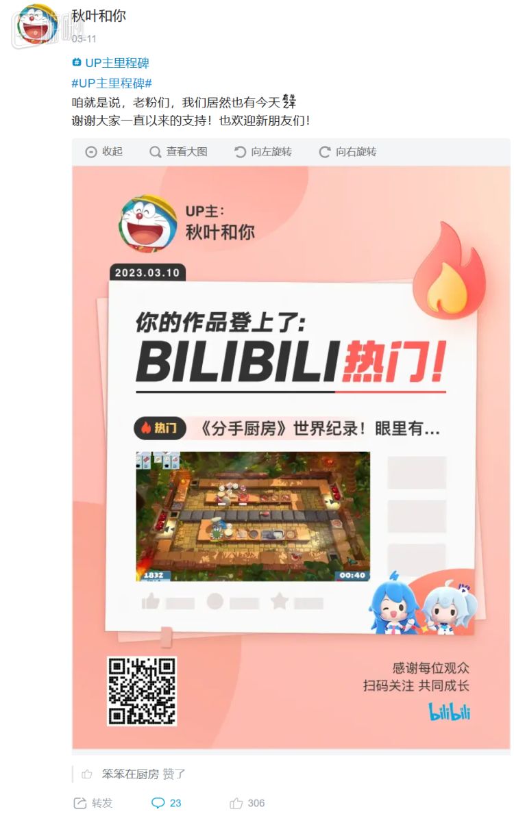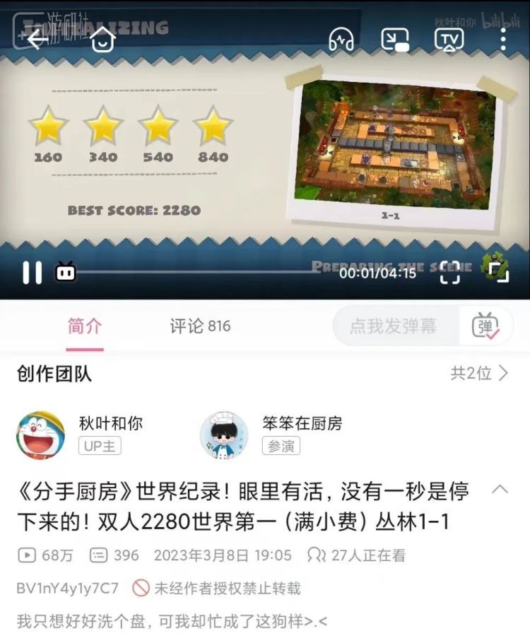 秋叶和笨笨也是熟络的搭档,一同拿下了许多纪录,在3月初,他俩又刷新了自己保持的丛林1-1纪录,这个视频也久违地让《分手厨房》登上了B站热门。