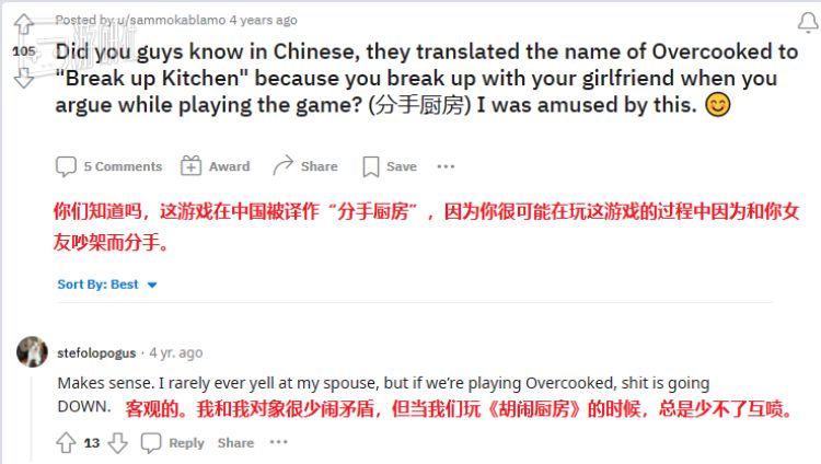 尽管“分手厨房”只是《Overcooked》系列在国内的民间叫法,但相比《胡闹厨房》或《煮糊了》两个官方译名,这个俗称不仅更知名,甚至还远传海外并得到认可——毕竟不管是哪国的情侣,都可能因为一起玩这个游戏而闹掰。
