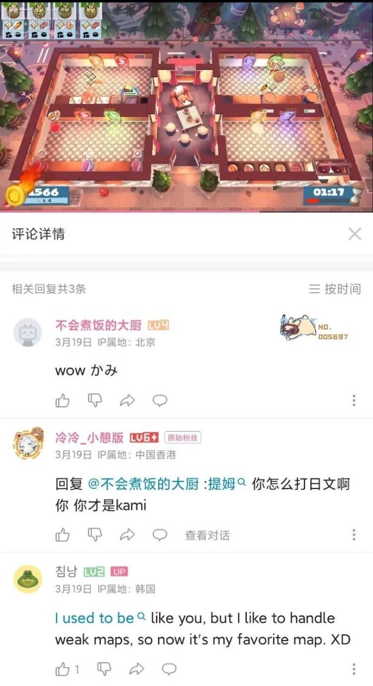 所以在那些纪录视频里,常能看见有弹幕对合作的玩家进行比较,这些发言通常无法从策略角度来真正理解玩家们的操作,只能评论些“小蓝比小红多切个菜、多洗个盘”之类浮于表面的内容,却很容易打击到对应的玩家。