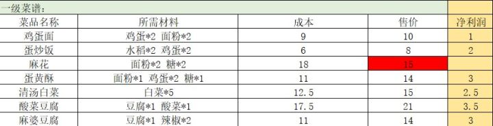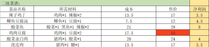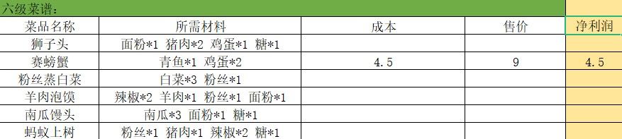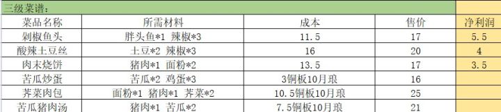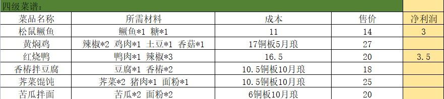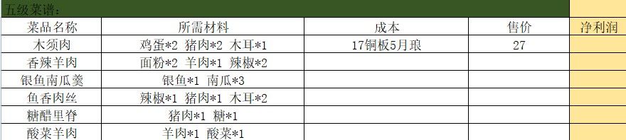 菜谱挣钱秘籍来了(备注:菜的成本是一份的菜谱掌握之后是必出双份,概率出三份的哦)(净利润:没有算需要月琅兑换材料的菜)(空的是还没有解锁,会持续更新)