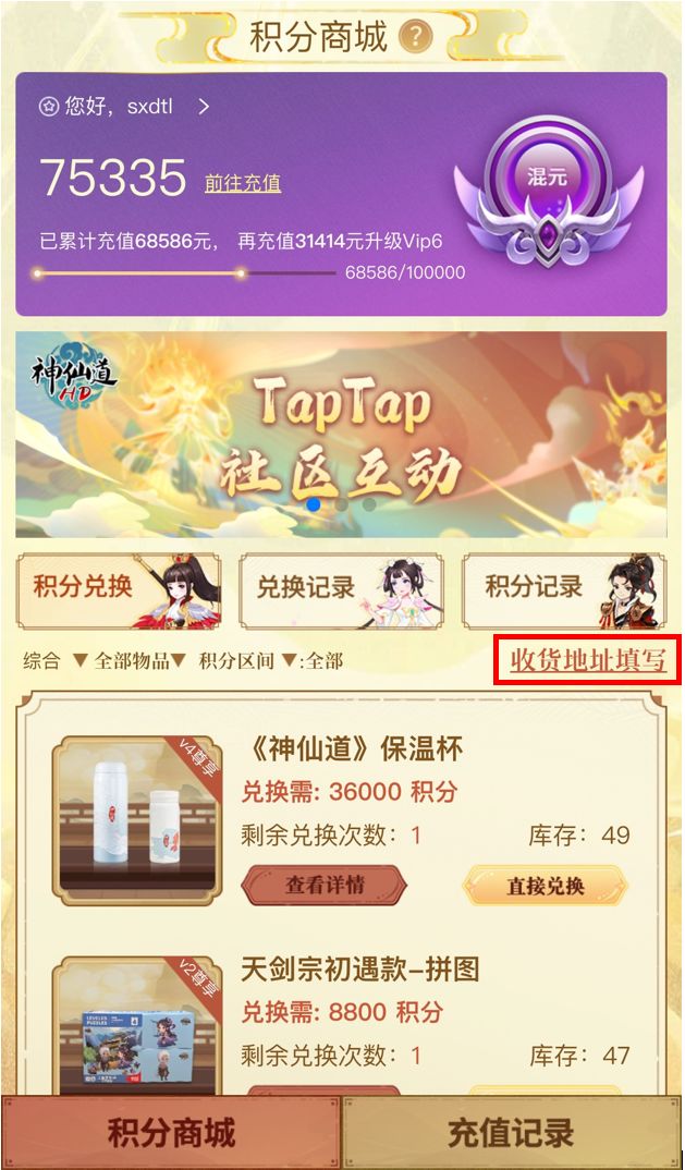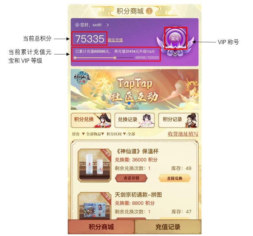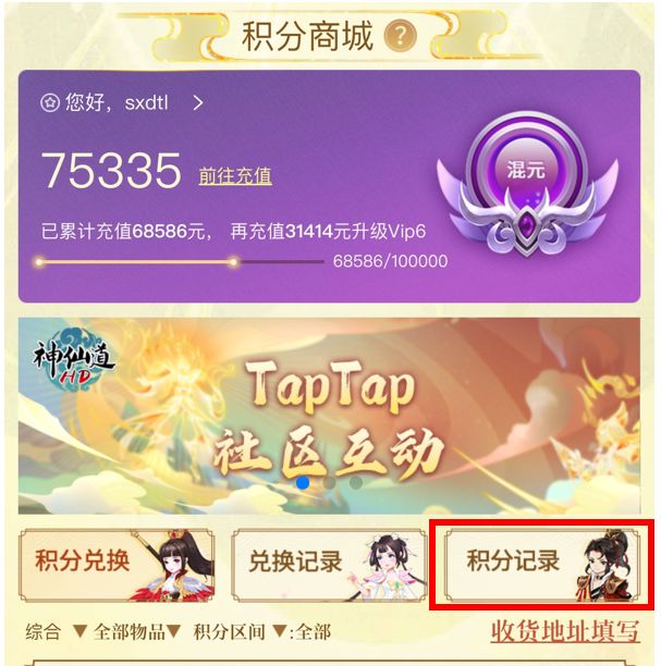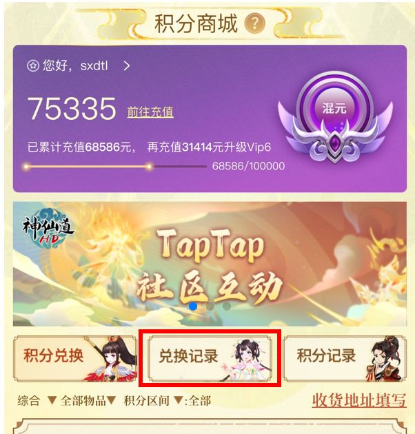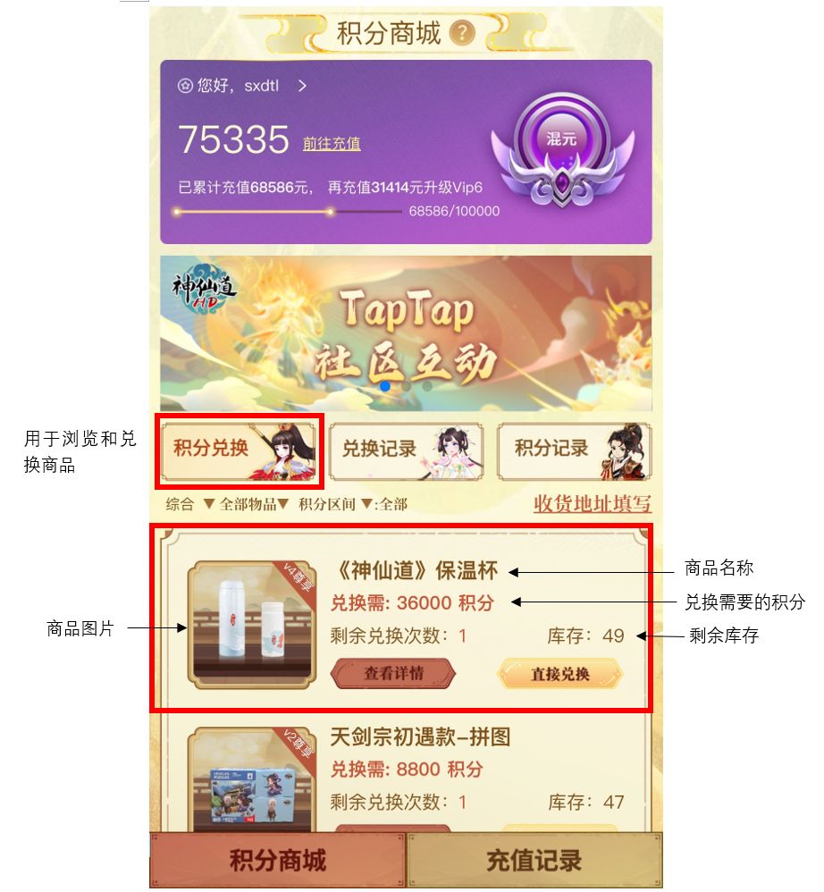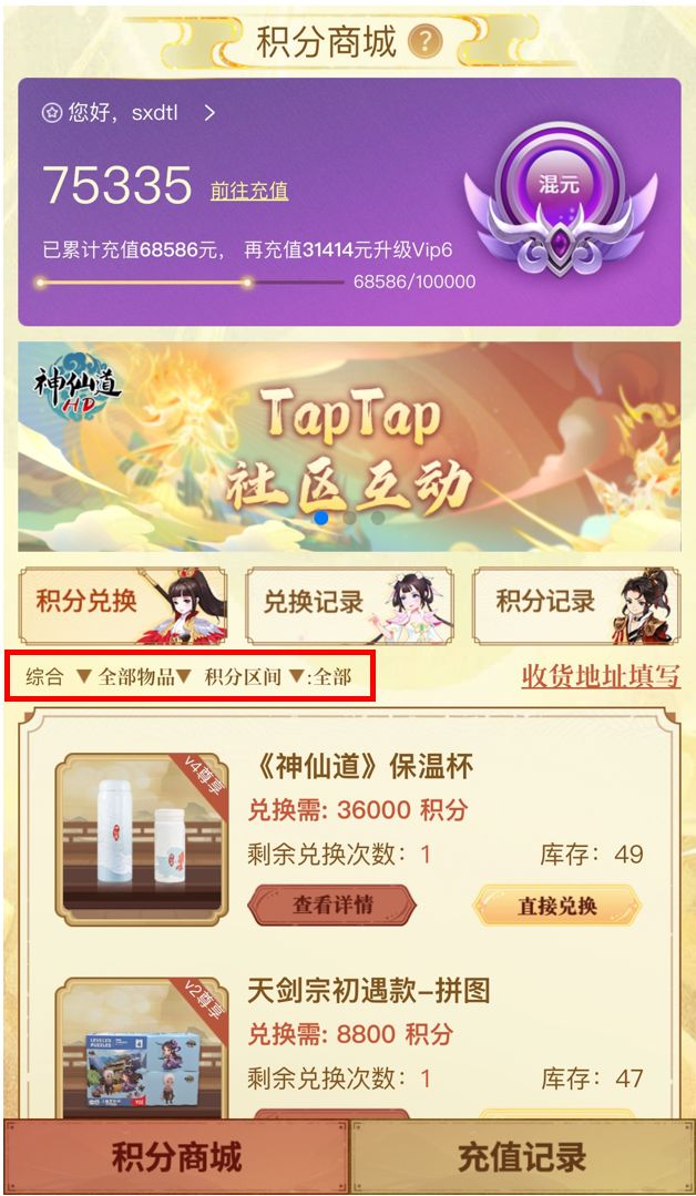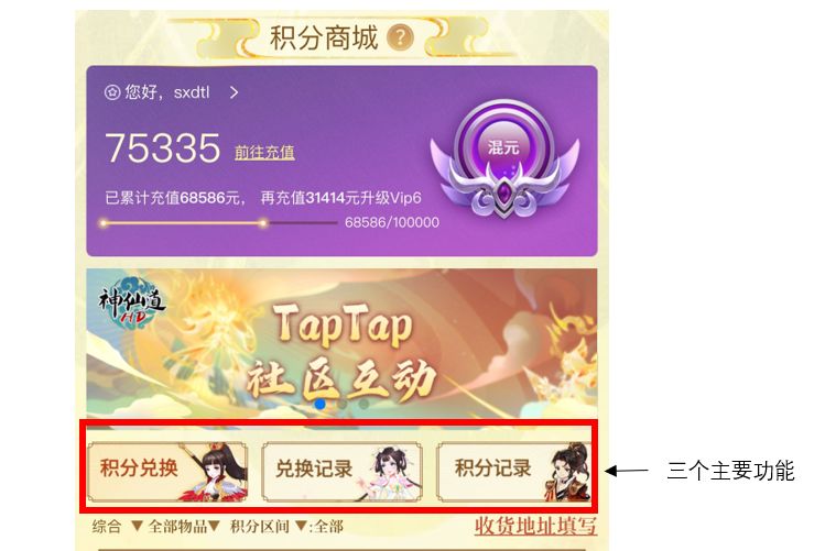 下面将为仙友介绍积分商城中的各项功能以及商品兑换流程规则: