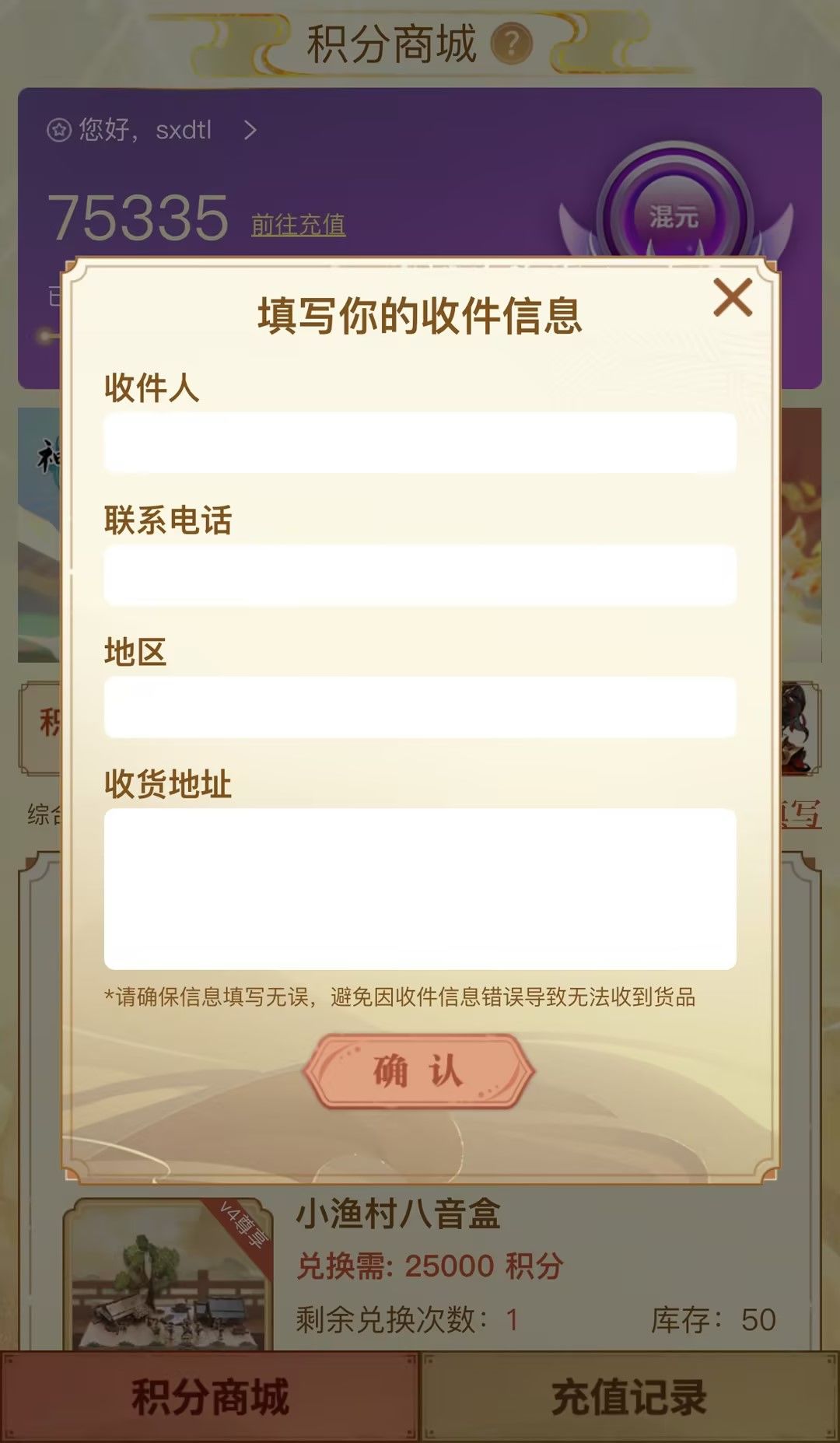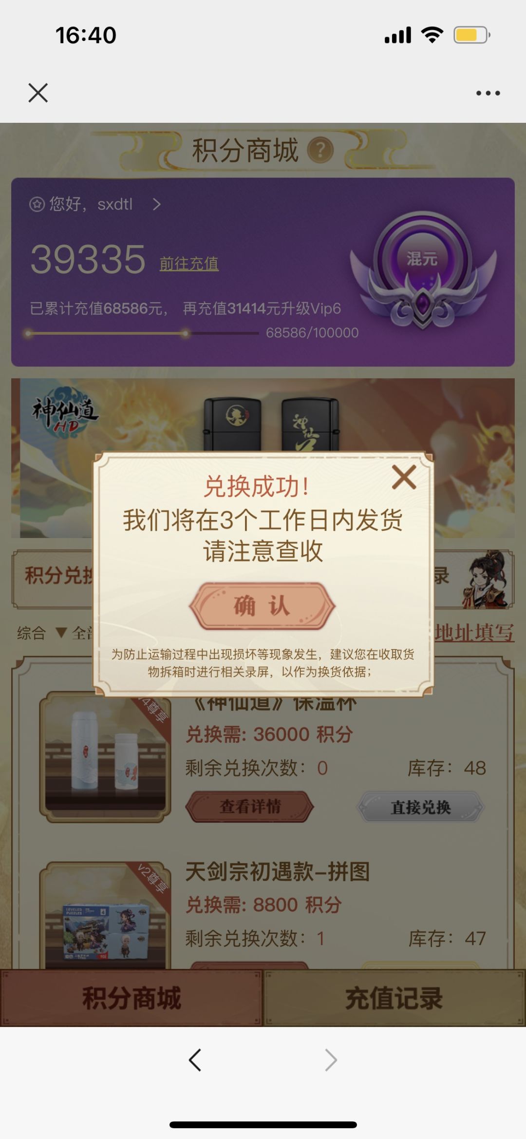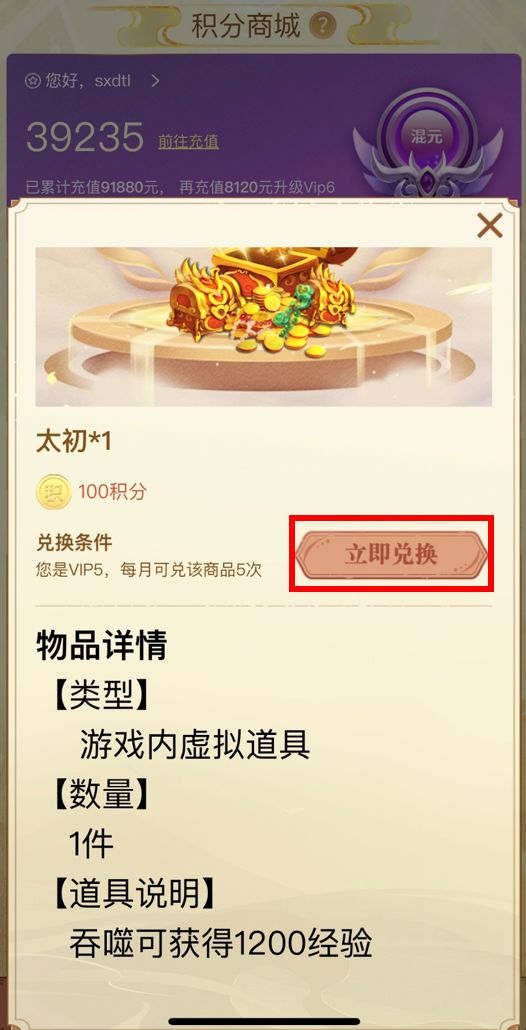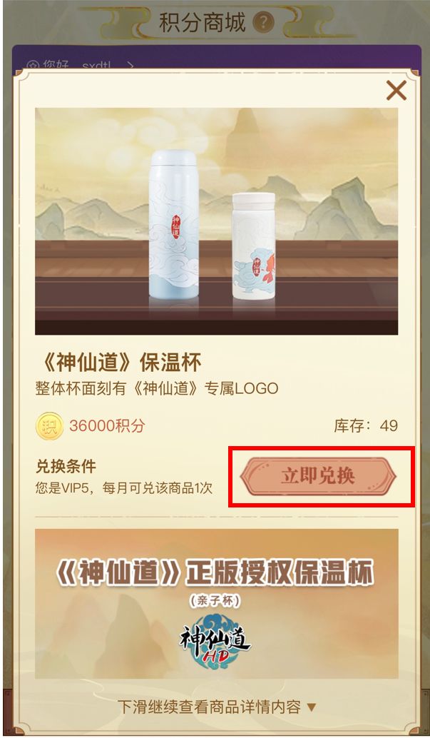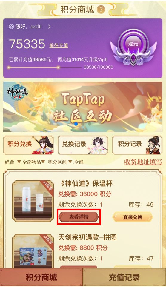 下面将为仙友介绍积分商城中的各项功能以及商品兑换流程规则: