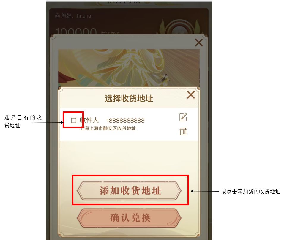 【收货地址填写】栏,针对于实物周边兑换后发放的收货地址,请仔细填写,认真核对