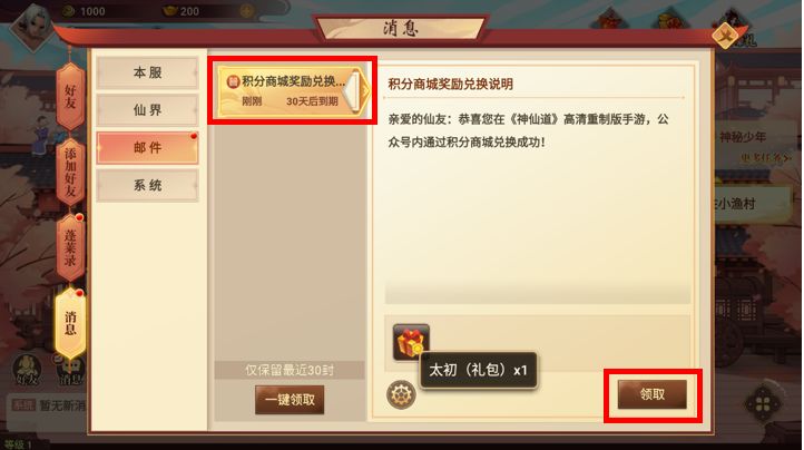 点击【邮件】可查看并领取虚拟道具: