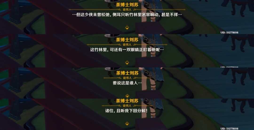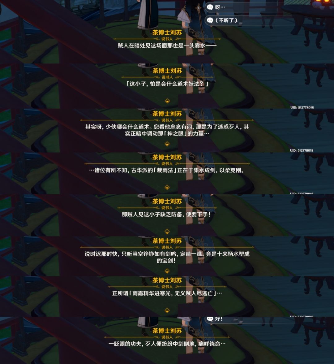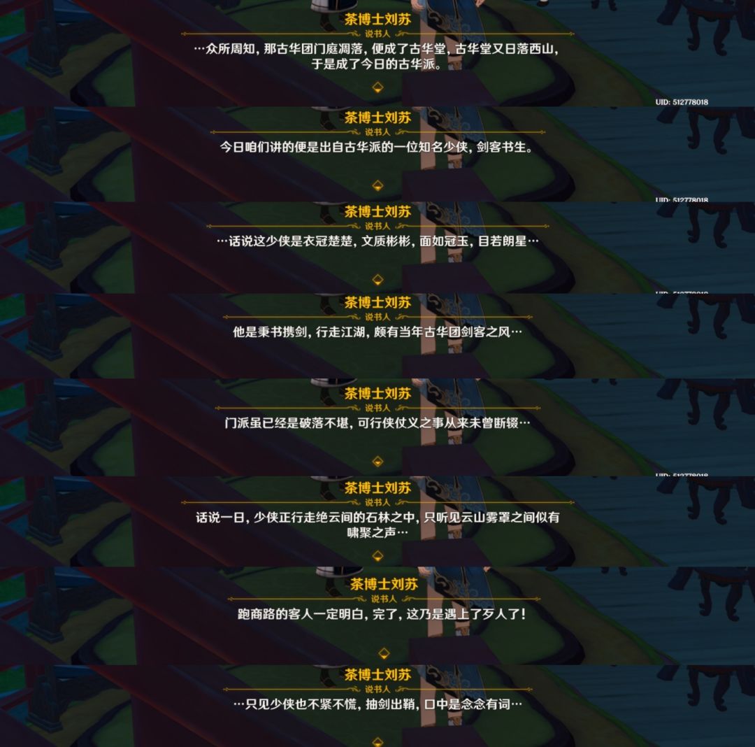 除了这些弟子以外,我们还能在其他地方看到对古华派的描写。比如茶博士刘苏的评书,看内容是关于行秋的。