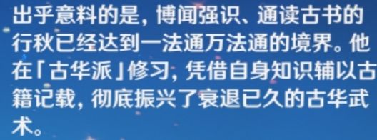 作为古华派的一个传承人,行秋对古华派可谓渊源不小。但其实这完完全全可以说是一个意外。因为行秋呢,爱好看书,整天就泡在绯云坡的万文集社看书,看各种各样的书。