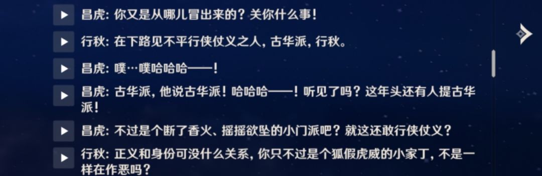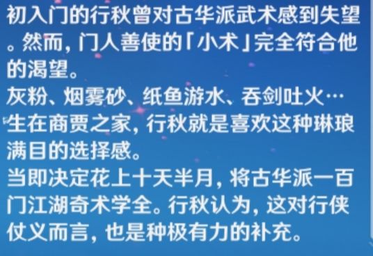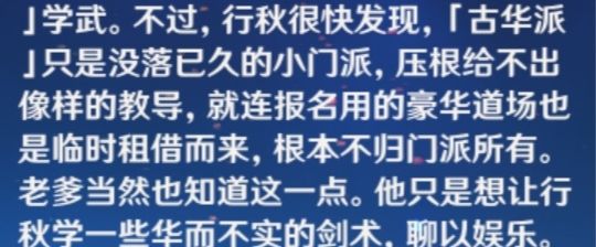 他老爹就急了,为了不让这个傻孩子真变成书呆子,于是准许他去古华派学习武艺。行秋傻,但是他爹不傻啊,让他去古华派就是为了让他安定下来,只学些华而不实的剑术。一开始行秋还挺兴奋,毕竟有武艺傍身,将来行走江湖不也容易些吗?但是古华派懂得都懂,衰落了不是?还有常九爷对古华派的态度,那可是相当的鄙夷,还有那个昌虎,还会特地把古华派叫做豆花派(见行秋传说任务)。