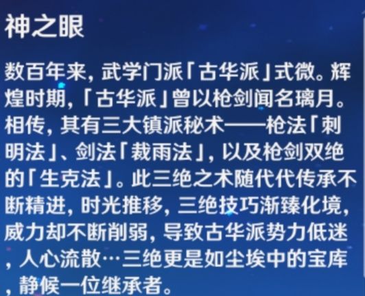 在古华派的全盛时期时,是以枪剑闻名于璃月的,三大镇派秘术分别为枪法“刺明发”、剑法“裁雨法”以及枪剑双绝的“生克法”。