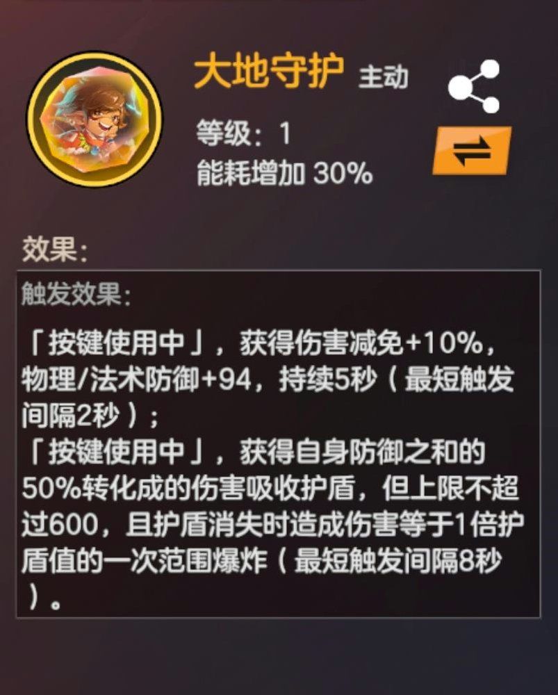 与契约石光耀魔矢一样,大地守护的触发条件也是技能处于「按键使用中」,但该契约石的效果不是造成伤害,而是提供守护。