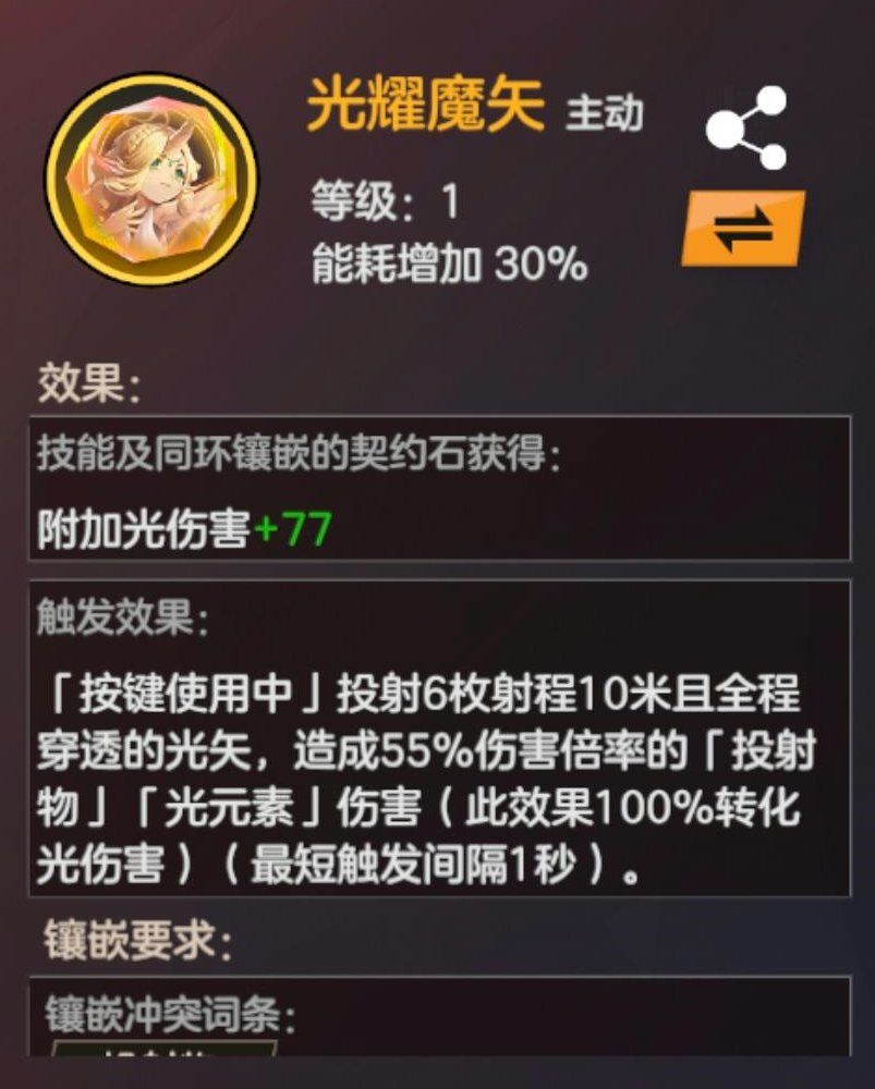 镶嵌该契约石后,当技能处于「按键使用中」,光耀魔矢将向前方释放全程穿透的光矢,对敌人造成伤害。