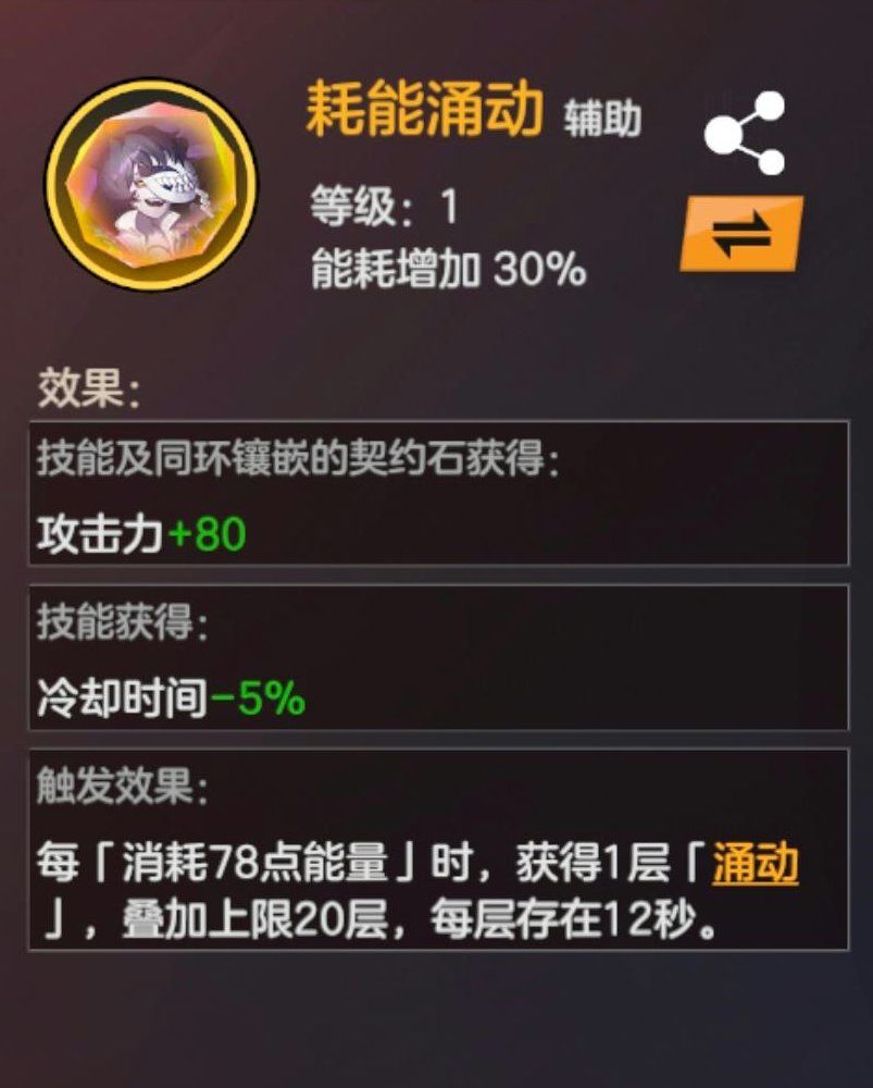装备“耗能涌动”后,技能每「消耗一定能量」,就可多获得1层「涌动」状态,每层「涌动」都会增添技能伤害。