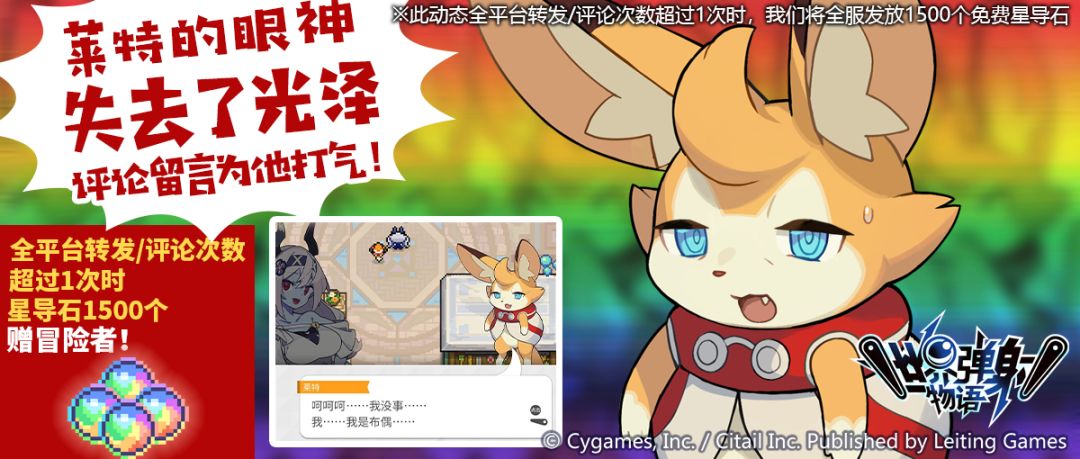 大危机!莱特的眼神失去了光泽,请转发这条动态,为莱特应援打气吧!当此动态全平台转发/评论次数超过1次时,我们将按照如下发放规则,全服发放【免费星导石×1500】!