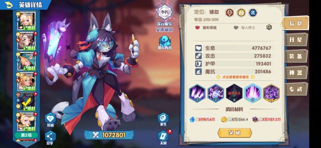 刷专武升级材料的时候,锡安和辅助们在一队,另外两个打手和光系剩下的蓝卡,再加上1到2张暗系(温蒂和第二周出现的暗系新辅助角色)在二队。现在第14天,我专武材料本排在前5名281颗星,足够三个4级专武装