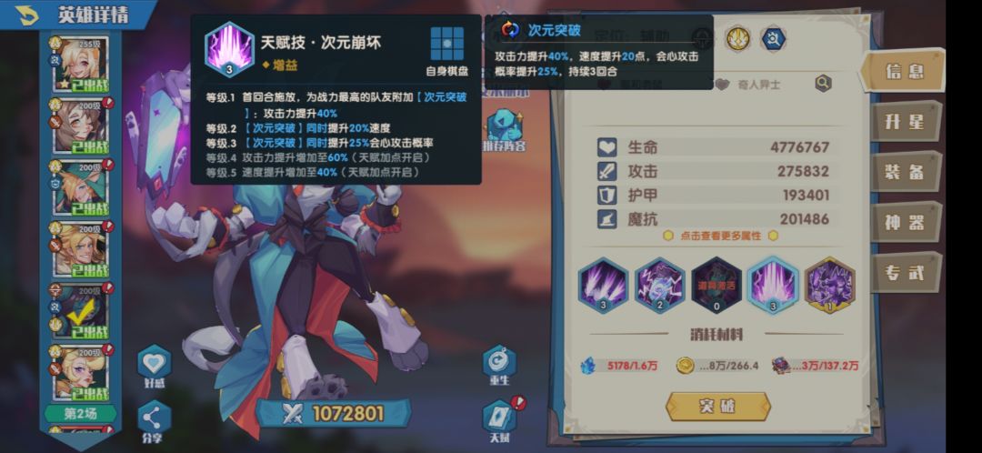 主力打手不朽之后,开始升第二个群攻打手克里斯特上不朽,并且第一个专武必须给她,只要开了,立马鸡肋的打一排变成打全体,并且有40%概率强控。光系有回灵羁绊,可以每个回合都放灵气技能,所以该专武的全屏控制效果可以靠反复试概率通关各种副本。自从她开了专武之后,我爬塔立马上了前十名,只会卡在攻击力不够,回合到了打不死的关卡。因为不充钱第6天才能拿到第1个专武,第八天才能拿到第2个专武。所以这个阵容发力有点迟…但买个六元的首充礼包,主力换上一套黄色装备,前50名还是能保证的,拿到专武后,第二周就可以起飞进到前20名,各个副本刷到前十名
