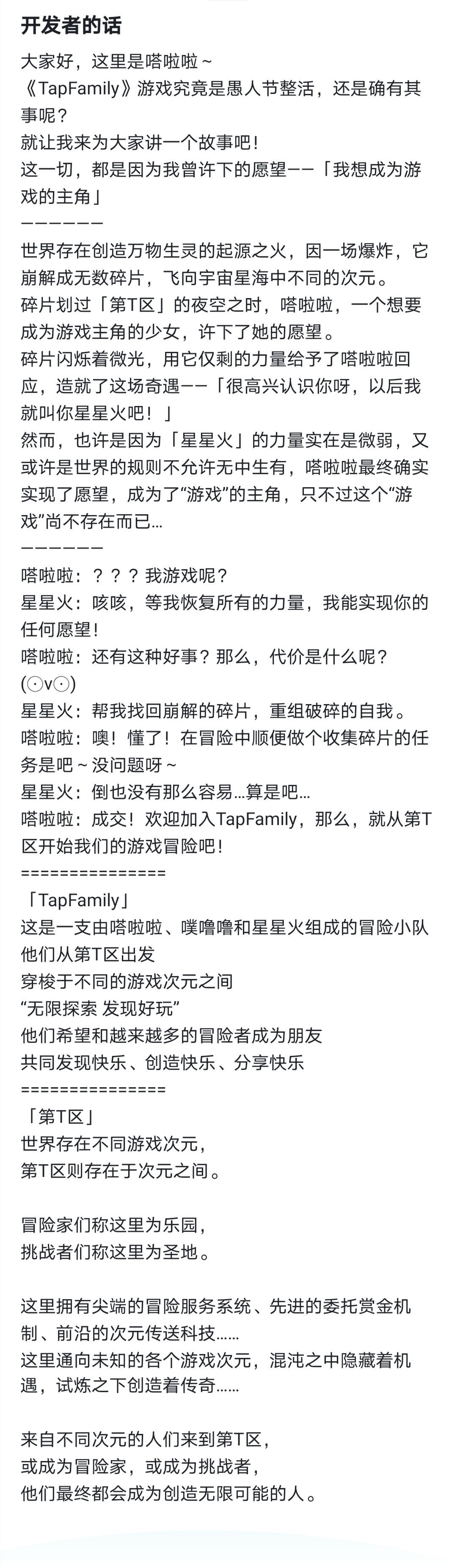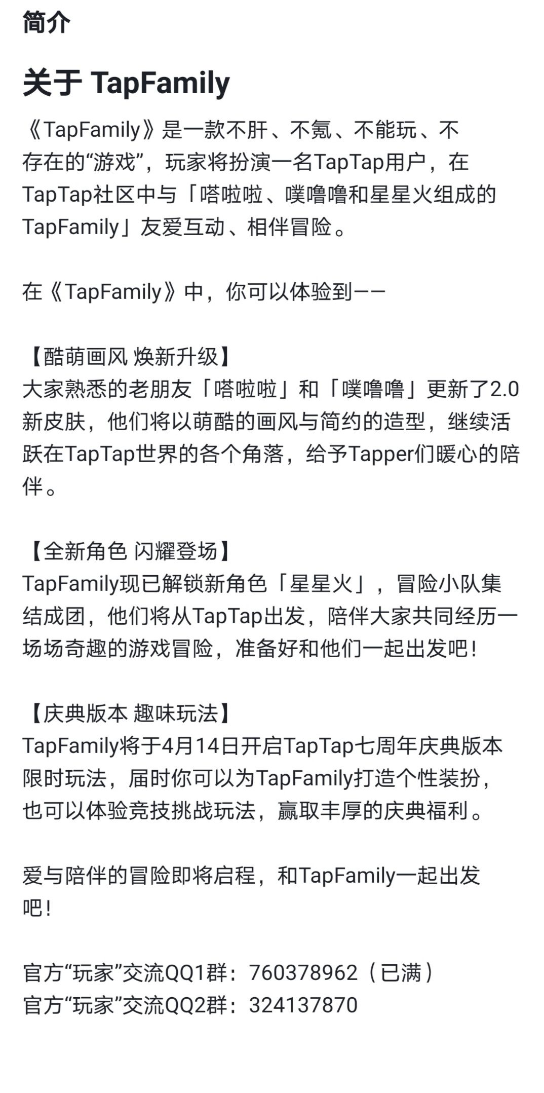 你说得对,但是《TapFamily》是一款不肝、不氪、不能玩、不存在的“游戏”,玩家将扮演一名TapTap用户,在TapTap社区中与「嗒啦啦、噗噜噜和星星火组成的TapFamily」友爱互动、相伴冒险。
