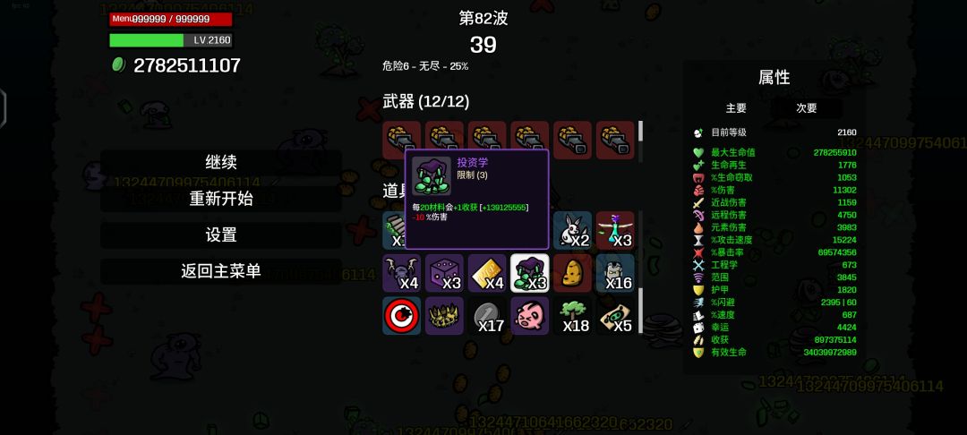 5.土豆发射器,土豆发射器的伤害是20%远程伤害和20%生命值加成,在前面几个道具加持下生命值已经十分恐怖,和伤害加成叠加,再高暴击伤害下,秒杀所有怪物!我目前还只打80关伤害就过一亿亿了。